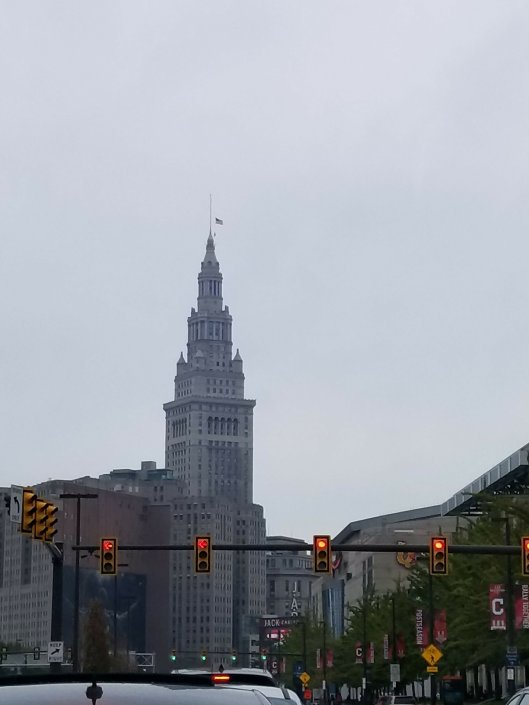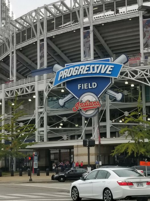 We set the GPS to “Avoid Highways” again today and had a beautiful drive through northeastern Ohio, catching the occasional glimpse of Lake Erie. We drove through the Cleveland suburb of Gates Mills and saw 2 does standing quietly on the side of the road. Unfortunately, we didn’t get a picture, and we didn’t see any others. We skirted downtown, and I realized why there were no downtown hotels available as we watched Clevelan Indians fans heading toward the stadium.