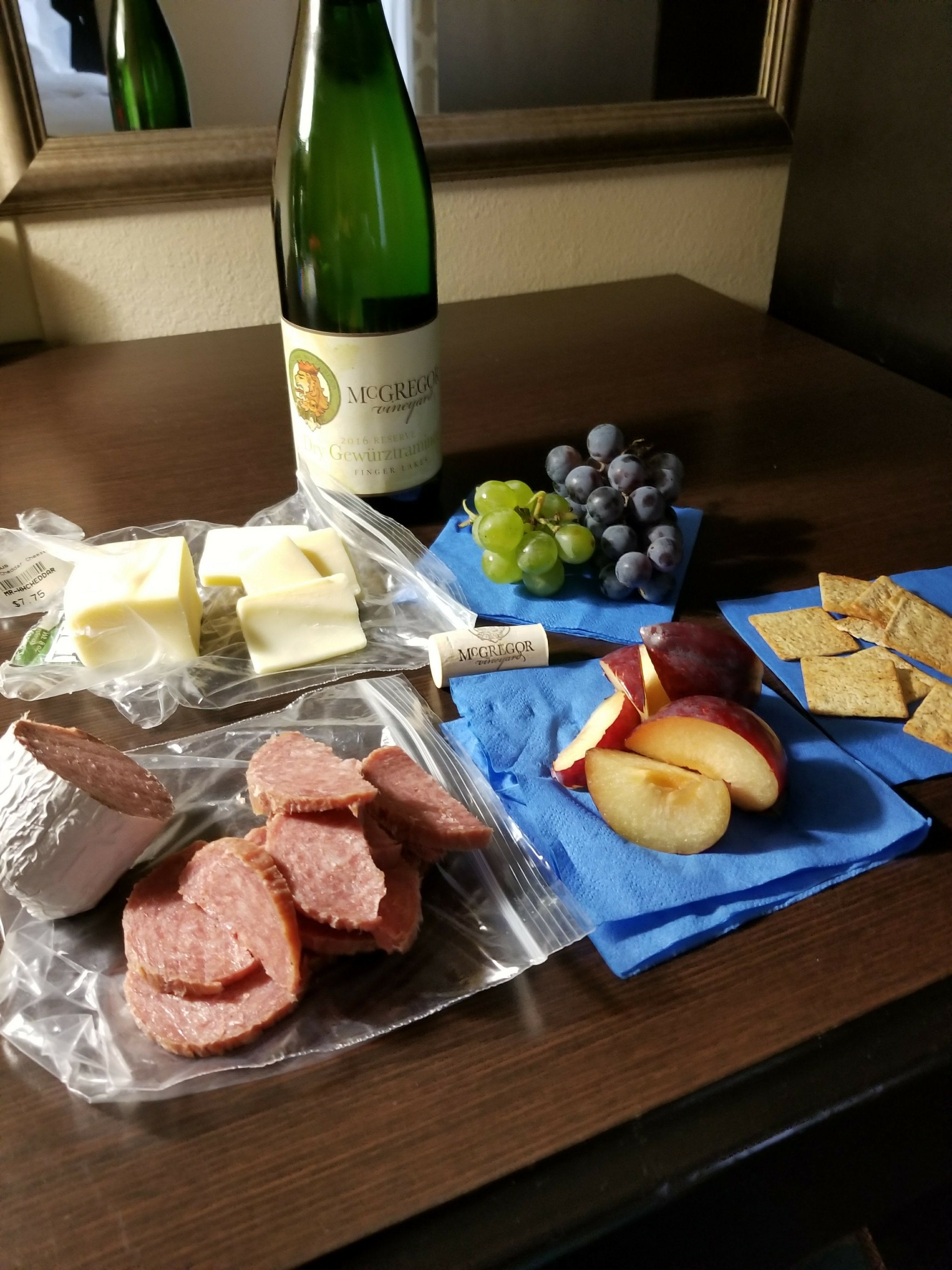 We hit the highway to tonight’s lodging, and opted to munch on the food that has traveled the country with us. (We have made a note to bring a small cutting board and plastic plates next trip.)