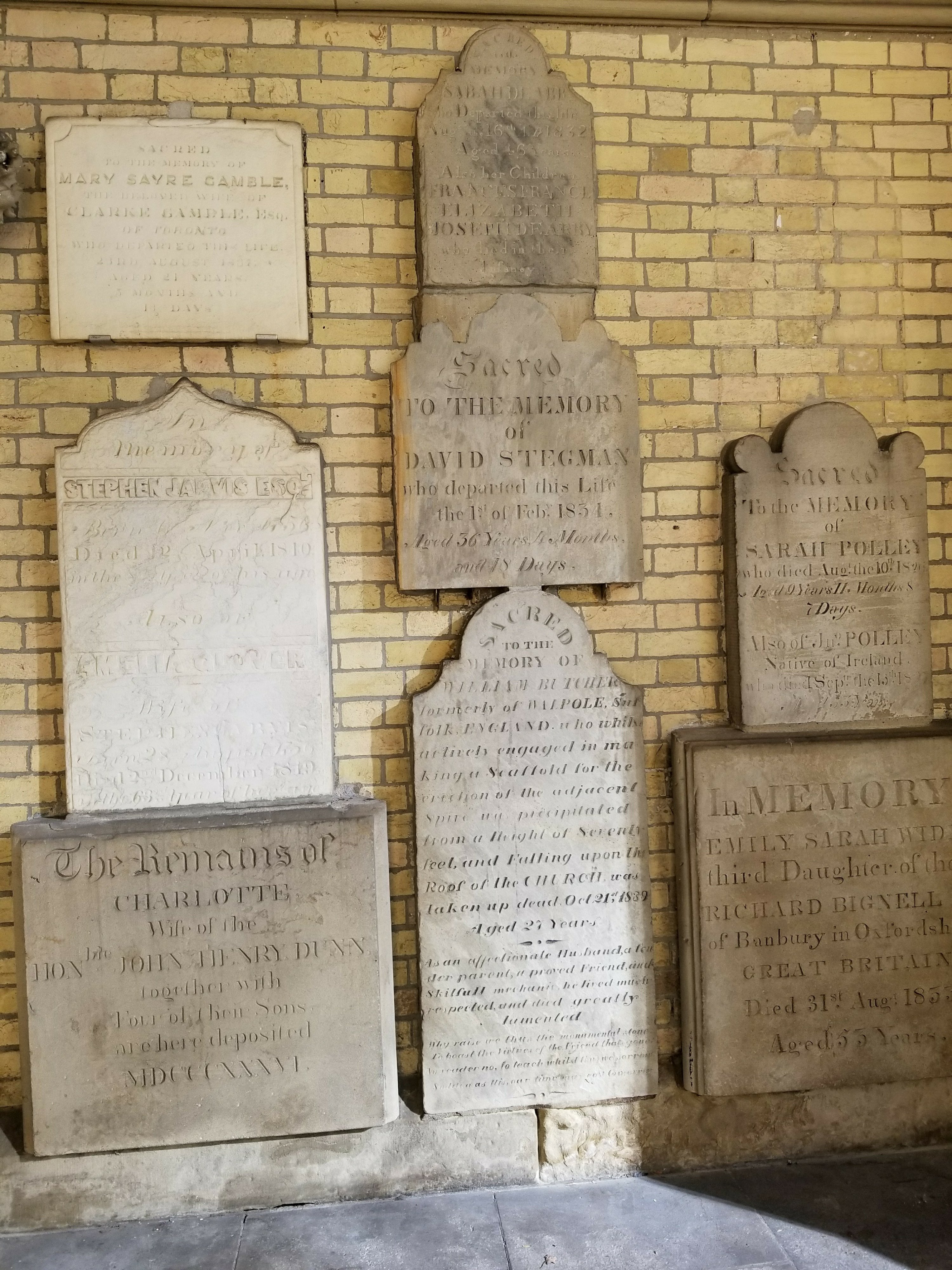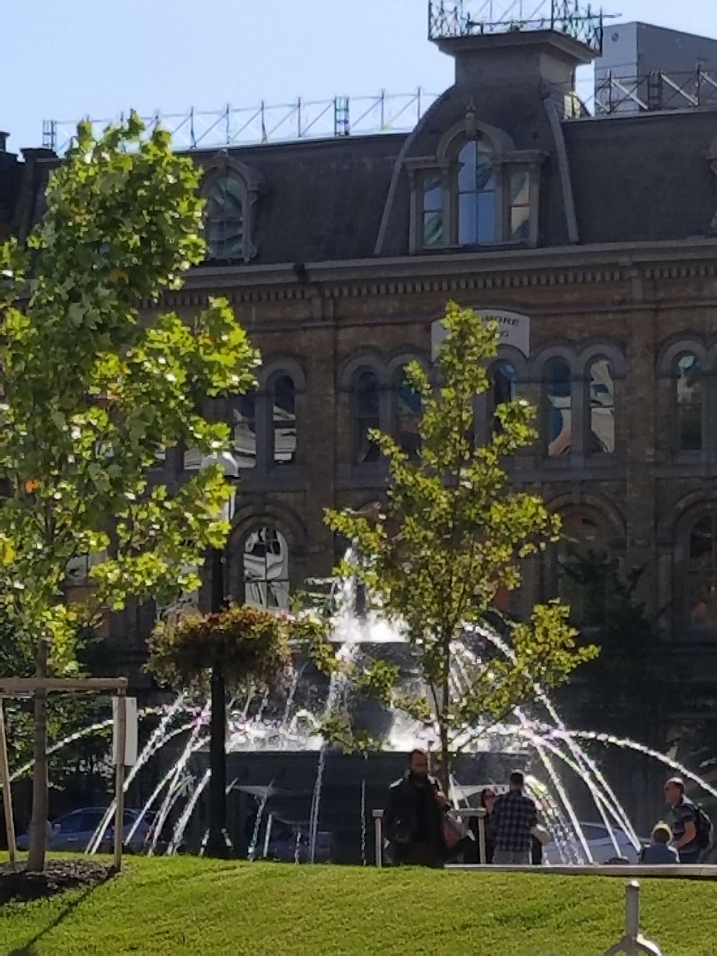 The plan this morning was to head out to St. Lawrence Market for breakfast before doing a bit of Toronto sightseeing by foot. Unfortunately. we learned the Market is closed Sundays and Mondays. We opted for a quick bite in the hotel, then headed out. Just across the street from the hotel is St. James’ Park. I could see the steeple through the treetops, so we headed in that direction. Turned out St. James’ is the Anglican Episcopal Cathedral. As we wandered through the park, it became apparent they were setting up for a movie shoot. Wish we’d found someone we could have asked what was being filmed!