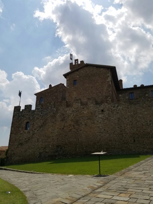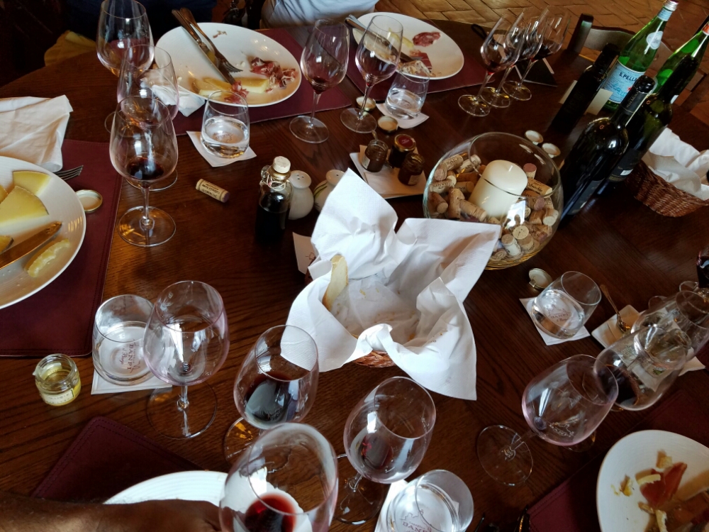 Our first stop of the day was Banfi Vineyards outside of Montelcino. A bit of a delay on our way due to a traffic accident.  Curvy, hilly roads and large trucks and vans coming in opposite directions can make for a very tight squeeze. But we arrived safe and sound and not much later than our reservation time.  We started with champagne in the tasting room while we waited for our table to be ready. Fantastic champagne – especially if my other half says he enjoys it, because bubbly is not his thing at all.  It was truly a million tiny bubbles dancing on your tongue with a dry, yet not too dry, finish.  Our favorite wine app confirmed we can get it in the US.  A good start to the day!