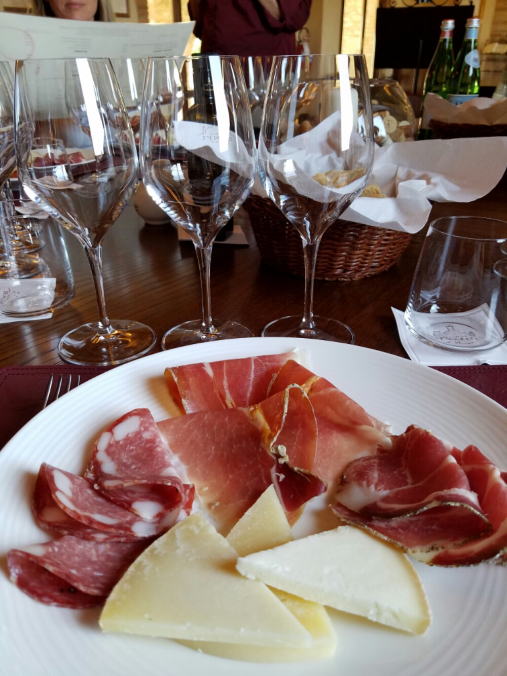 We were seated for our tasting and served a selection of cheeses and salami. We opted for the bottle tasting rather than the flight tastings. One bottle would give each of us enough of a taste, and we could revisit it until the bottle was empty.  Much more efficient and less expensive than the flight of 3 seletions. We learned a lot about the brunello varietal, the wine produced in this area. 100% sangiovese grapes, but the fermenting and aging process are what make it a brunello. (Lots of time macerating with the skins, and an extended aging period both in large barrels and in the bottle.)