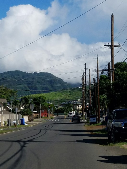 Our first stop this morning was the Diamond Head Grill and Market. This is a hidden gem just outside the Waikiki strip on Monsarrat Street. They make cream cheese scones that are sinful – moist, flavorful and with a dollop of cream cheese in the center that you don’t find until you bite into it. D. had banana, I chose pineapple. They rotate three flavors each day of the week. In addition to the bakery, they have a take out window for breakfast, lunch and dinner, and a little market with pre-made salads, sandwiches and fresh fruit. From there we wound through neighborhoods to get to the freeway.