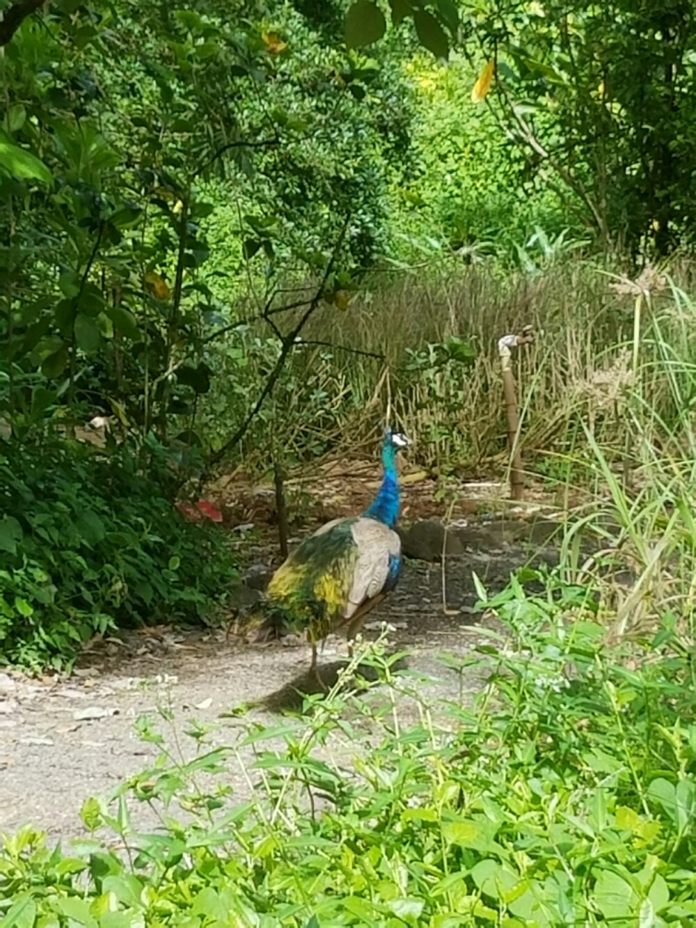 An easy walk back down, and we were treated to a peacock sighting.  There were signs posted that they are aggresive and should not be fed when we entered, so I cautiously followed him down a trail to get a photo.
