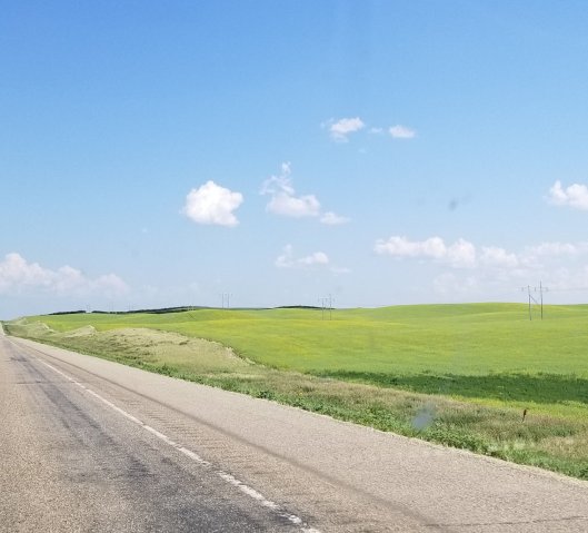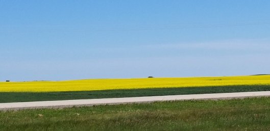 For two days we have felt like we were following the yellow brick road, but it was a beautiful crop of yellow something that stretched for acres. It looked remarkably like mustard, so that’s what we thought it was. We found out tonight from our wonderful waitress that it is canola. Yellow and blue canola is one of Alberta and Saskatchewan’s main crops. File that away in the memory bank for future reference! It was still a beautiful sight today on our way to Regina.