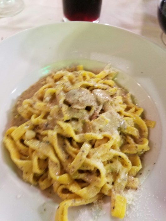 Dinner at a neighborhood restaurant outside the city center. Pasta and risotto primi courses, rabbit cacciatore and calamari spiedino for secondi. Neither of us could finish either of our courses – the portions were enormous! A final tiramisu and glass of grappa rounded off the meal.