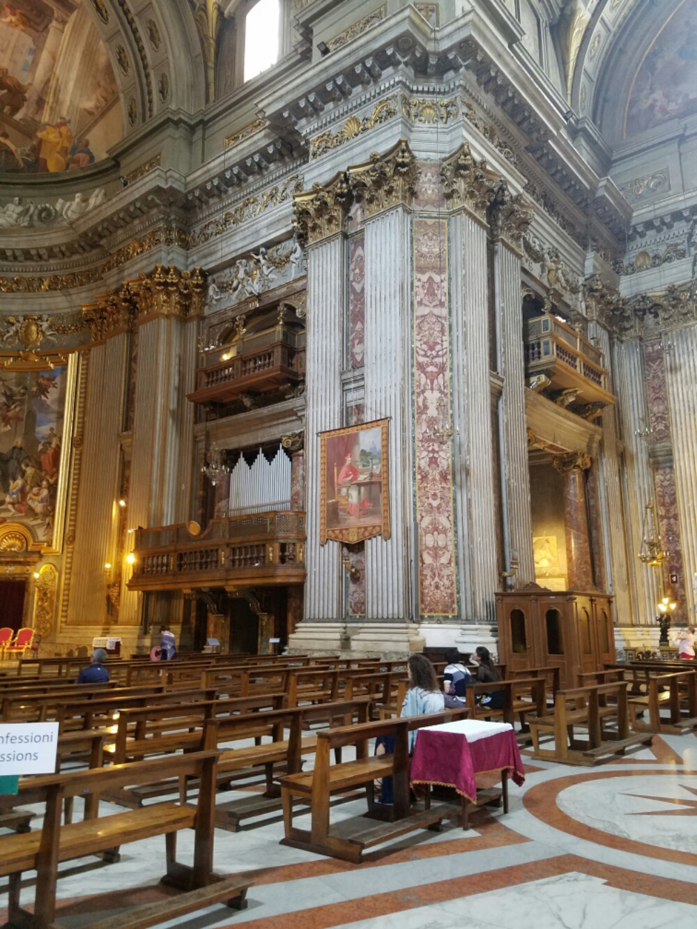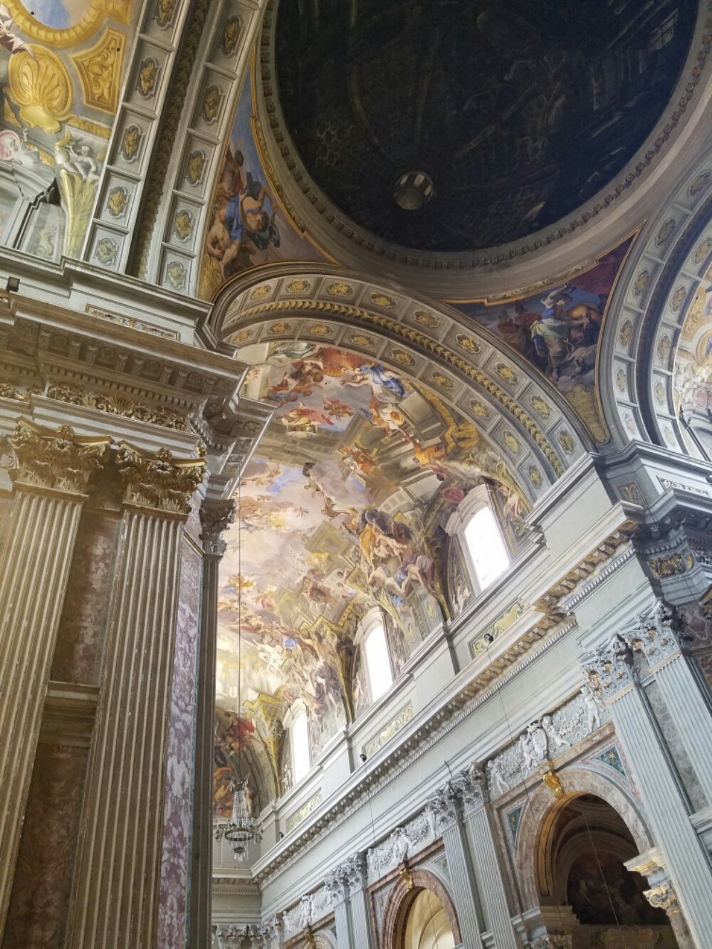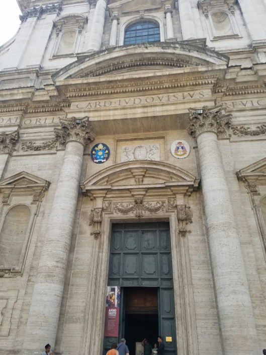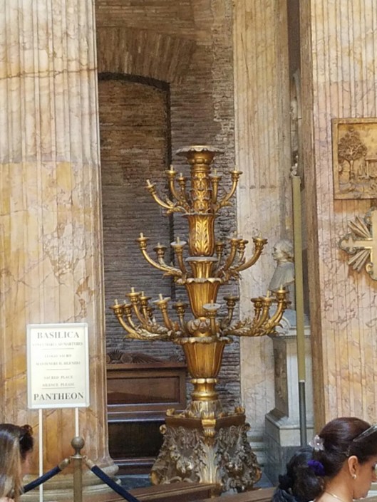 The next piaza had a rather non-descript church from the outside. My other half and I waited outside while the others ventured in to explore. What could top St. Peter’s and the Sistine Chapel? Based on their encouragement, we went in for a tour…and very glad we did! Gregorian chant being played quietly through the speakers seemed to have a magical effect on all visitors – the level of respect and quiet was considerably higher than the day before.  I wonder what effect piping music into the Basilica and Sistine Chapel would do? Might bring down the amount of “shushing” and overall chatter. But, it might not with the tour guides trying to hold their group together and impart information.  It makes me wonder, though.