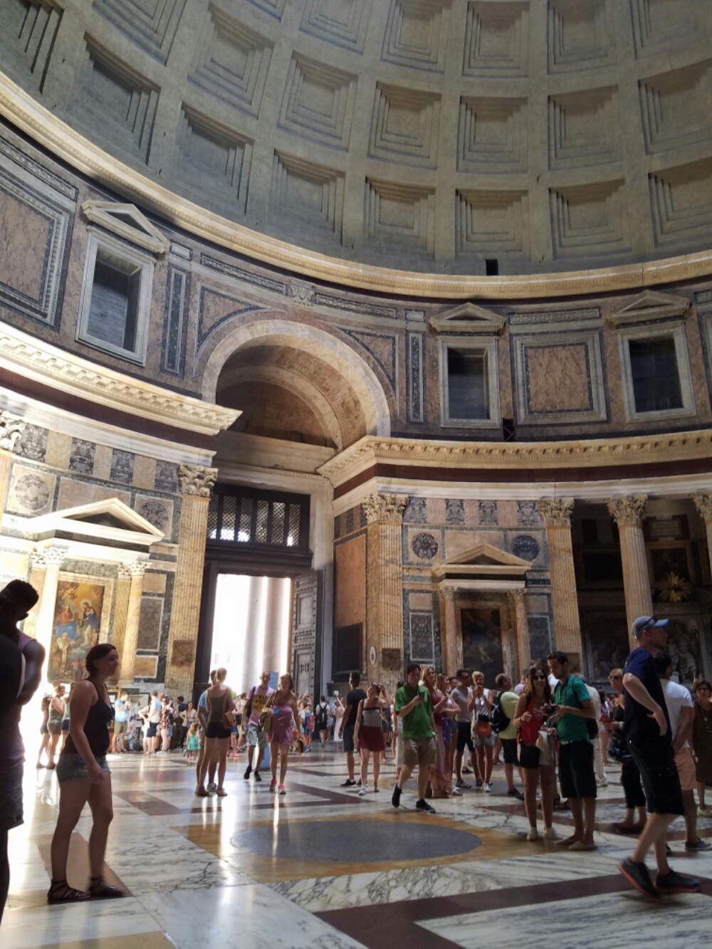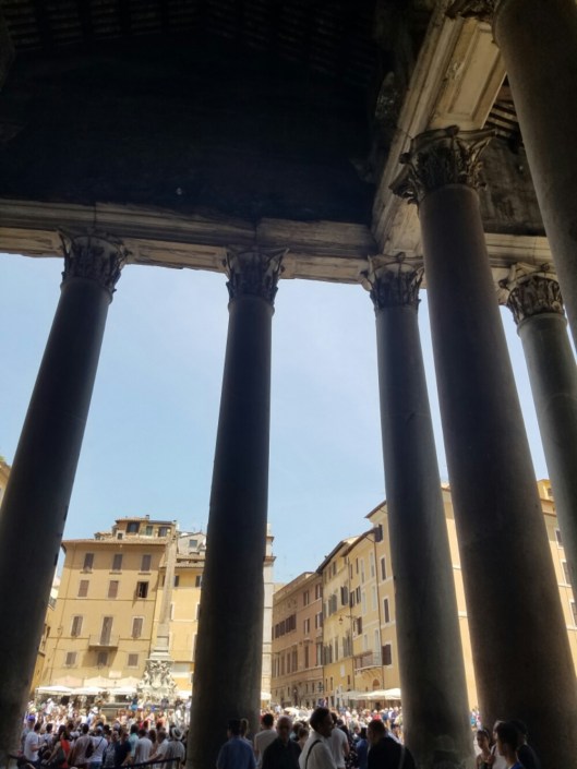 From there we found the Pantheon. Seemed like it was dropped in the middle of the city.  There was a long line to get in, but as admission was free it moved rather quickly. 2 Roman “soldiers” were outside the exit posing for photos.