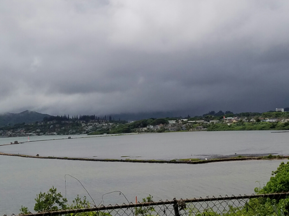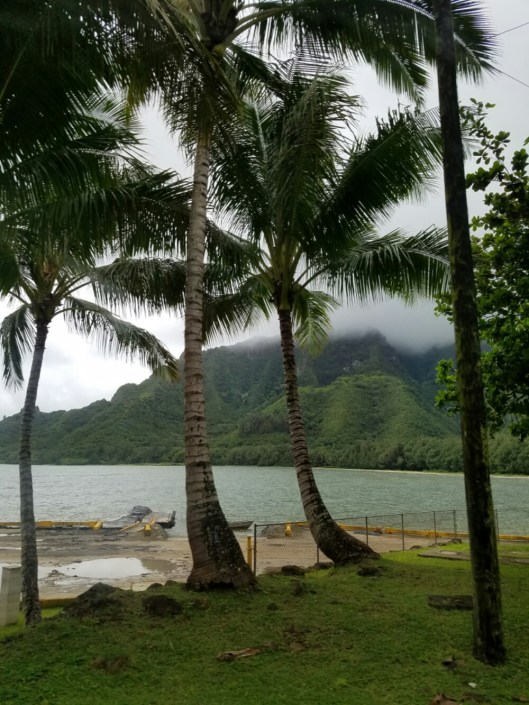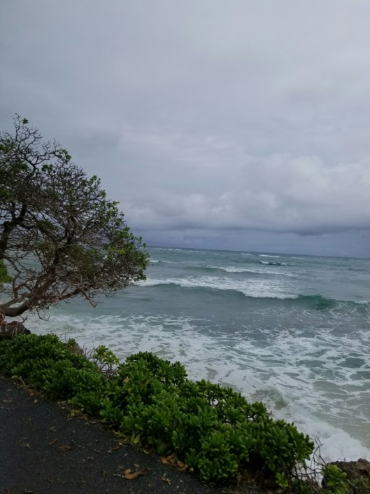 Today was an early start as we had to meet the tour bus at 7:30 for the Hidden Gems Tour of Oahu. We were up in time to see the sunrise, but being on the west side of the island with a mountain range in between, it was a little hard to see.  And the cloud cover wasn’t helping much, either.  Once the van was full our driver, Mikos (the short version of his name. He is named for 7 generations of grandfathers, so his given name is very long!) pulled over and had us introduce ourselves. Quite an international group in our tour – Australia, New Zealand, Portugal, Brazil, Egypt, Alaska, Slovakia, California, and of course, Arizona and Georgia. It made for very interesting conversation throughout the day, but I have to say the youngest two Californians did not make the best impression. They did provide us with plenty of “entertainment” throughout the day, though. Our driver was very patient and kind…I’m sure he has seen it all! The driver’s wife and 2 year old grandson were also along for the ride.