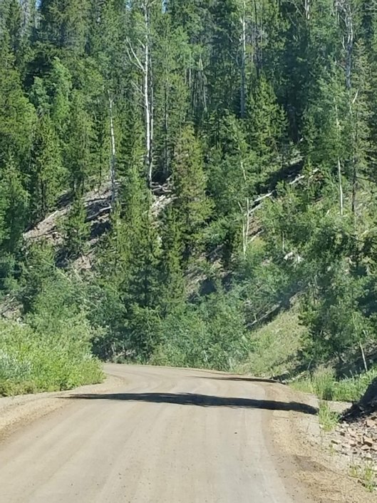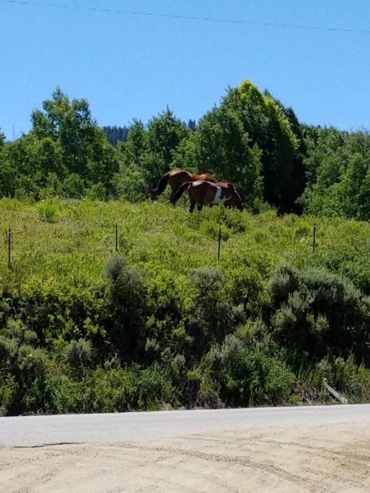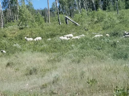 We drove north on County Road 129, passing through Hahn’s Peak and Iron Mountain. We watched stands of white birch and aspen groves glistening in the warm summer breeze. The first highlight, though, was the sight of sheep on the side of the road, the rancher on horseback at the edge of the woods, and the little lamb who decided to nurse as momma crossed the road.